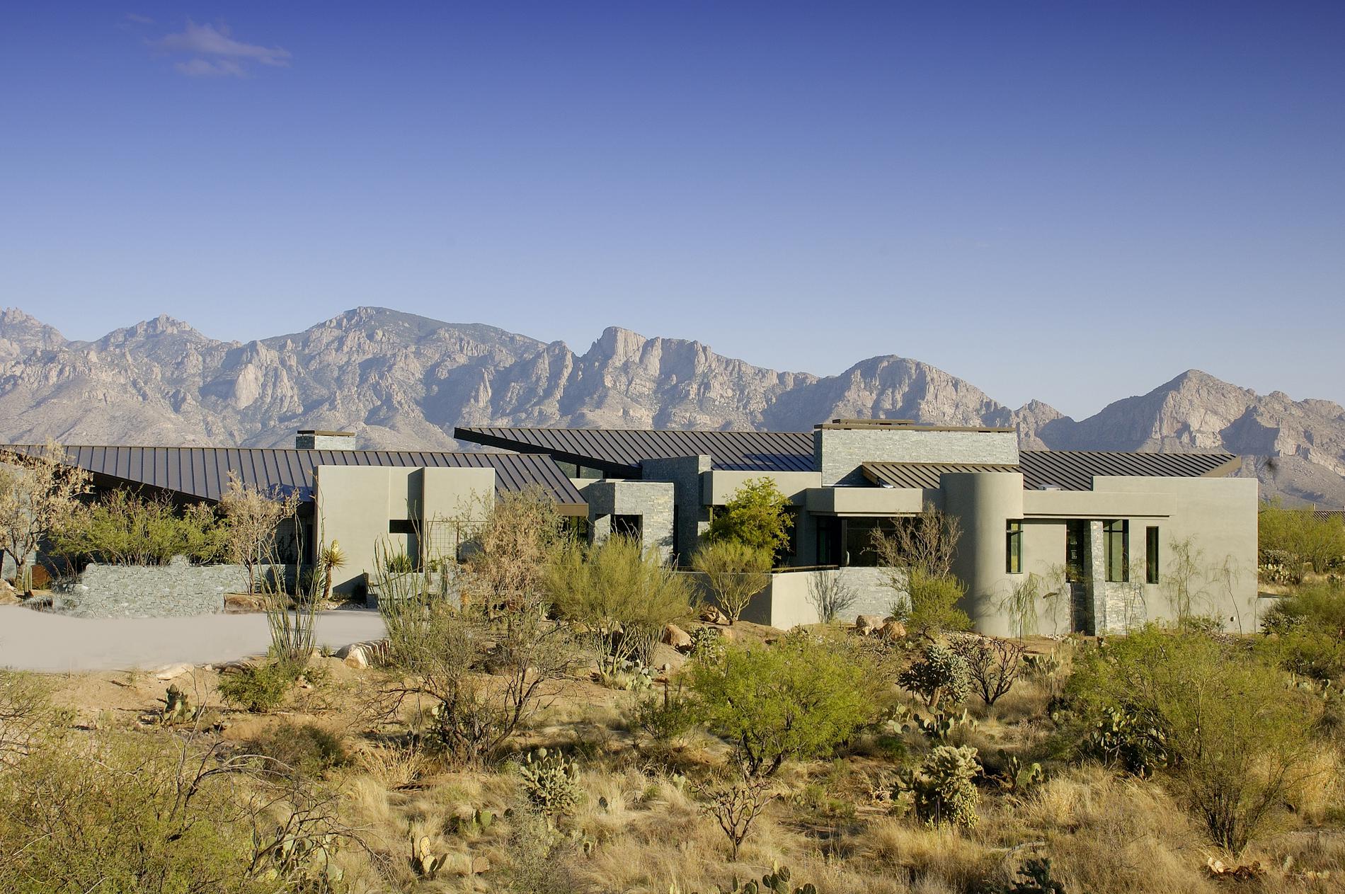 This residence was designed with a modest street presence and yet still creates a panoramic view of the desert from the inside. The sloped planes of the roof draw the eye out to the vista beyond. The open planning connects the great room, dining, and kitchen into one large comfortable space. Multi-sliding glass walls extend the living spaces out to the patio; bring the activity flowing naturally outside. This fusion enables the inhabitant to wholly appreciate Southern Arizona’s climate, which affords its residents the opportunity to entertain outside the majority of the year. This outdoor sala is a second living room that has an intimate relationship with the environment that it inhabits.
